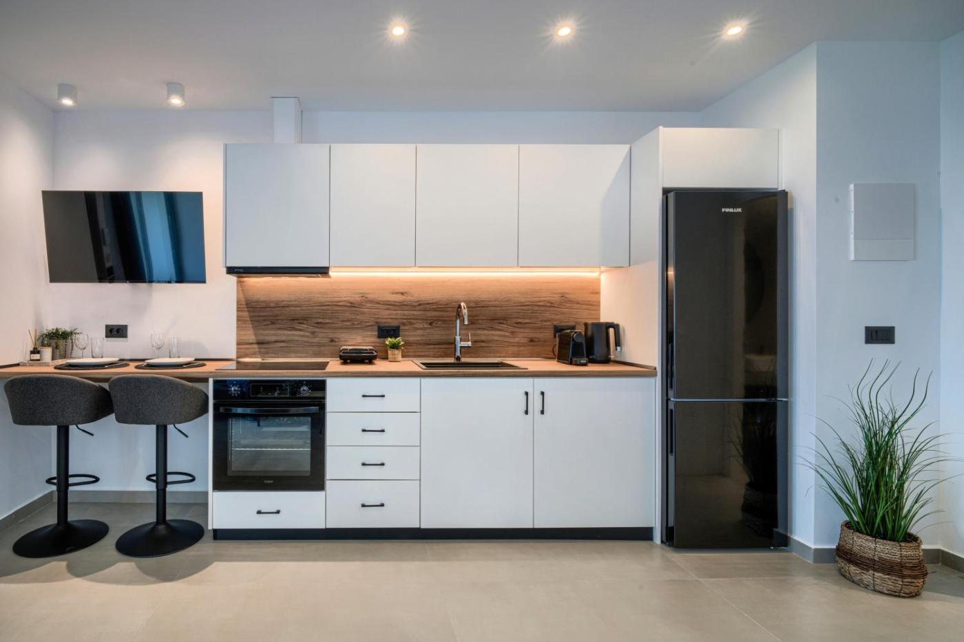 One-Bedroom Apartment. This air-conditioned apartment comprises 1 living room, 1 separate bedroom and 1 bathroom with a shower. Meals can be prepared in the well-fitted kitchen, which comes with a stovetop, a refrigerator, kitchenware and an oven. Featuring a terrace with sea views, this apartment also provides a washing machine and a flat-screen TV. The unit offers 2 beds.